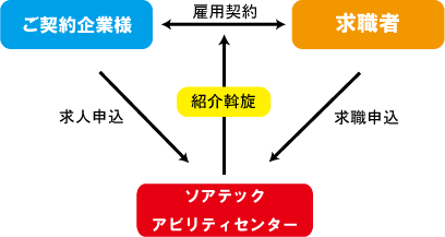 職業紹介とは、図のように弊社がご契約企業様と求職者の皆様から求人および求職の申込を受け、弊社からの人材紹介・求人紹介により、両者間の雇用関係が成立するよう、サポートをさせて頂くシステムです。求職者様に対しては転職サポートという形での対応となります。